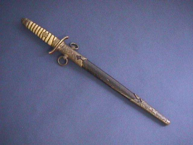 English: Japanese Navy Officer's dress uniform, that belonged to Flight Lieutenant Nobuya Kinase, Imperial Japanese Navy (Air Force), WW2 navy blue woollen cloth jacket, peaked cap with embroidered bullion naval badge, dress dagger and sheath, leather dagger belt |